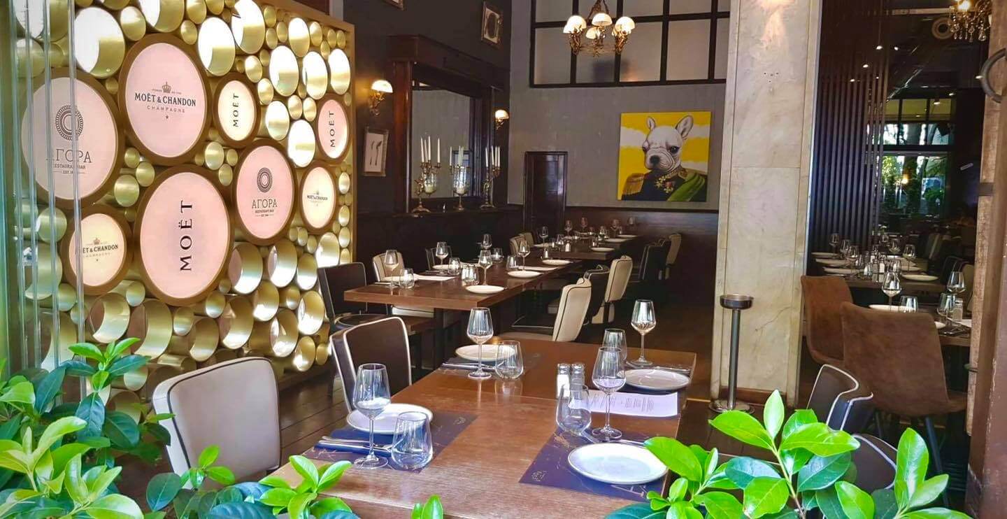 Κομψό εστιατόριο με μοντέρνα διαρρύθμιση και μεγάλα παράθυρα που σερβίρει ελληνικά και διάφορα ευρωπαϊκά πιάτα.