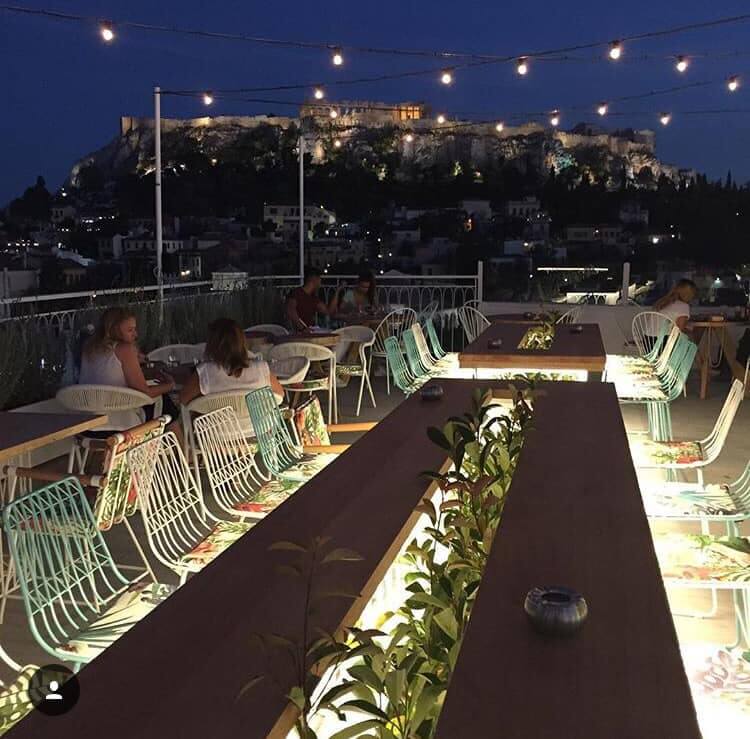 Κομψό εστιατόριο και μπαρ με καταπράσινη βεράντα σε ταράτσα που προσφέρει θέα στην Ακρόπολη.