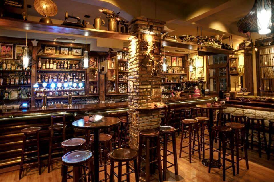 Rock μουσικές εξυπηρετικό σέρβις παγωμένες μπίρες και κοκτέιλς στο vintage διακοσμημένο περιβάλλον